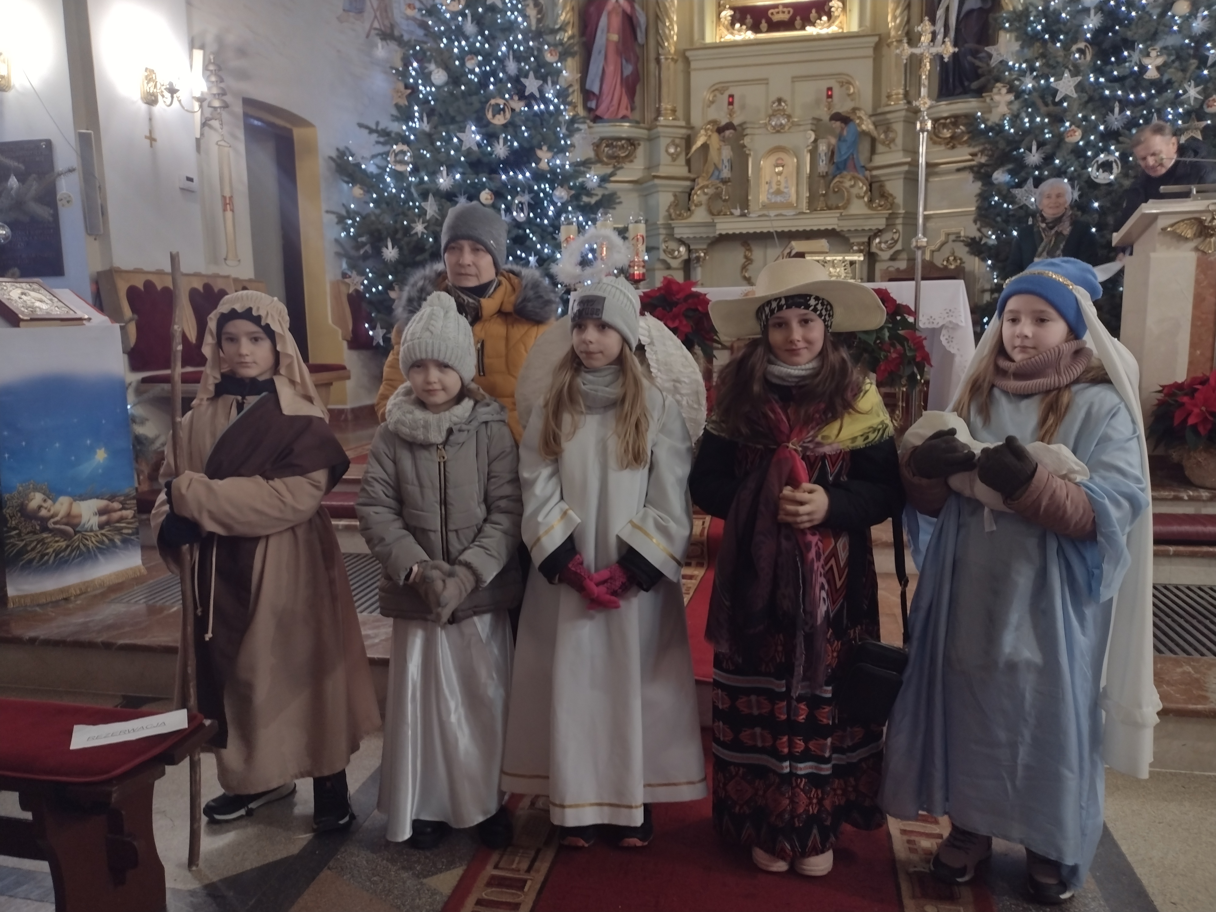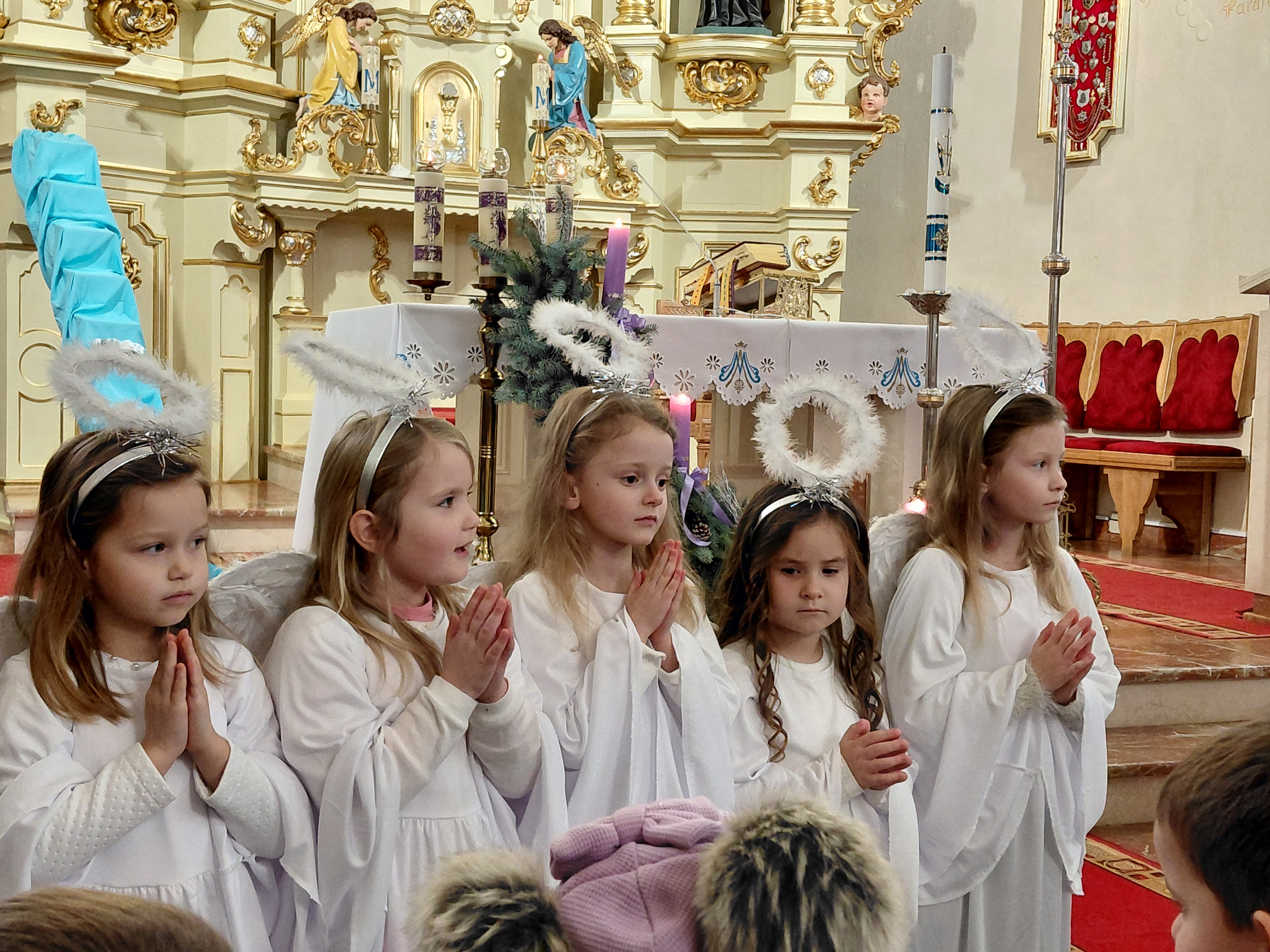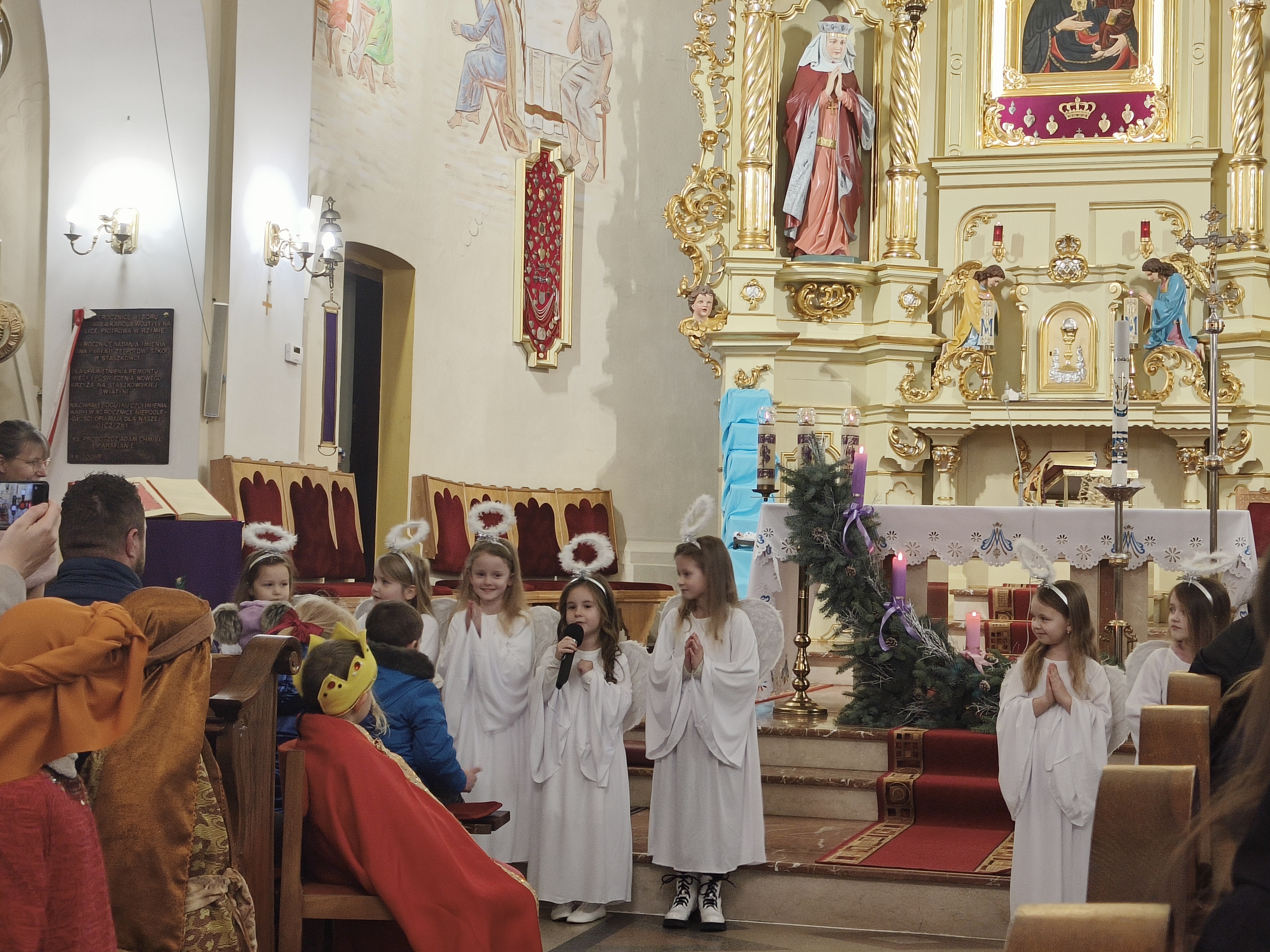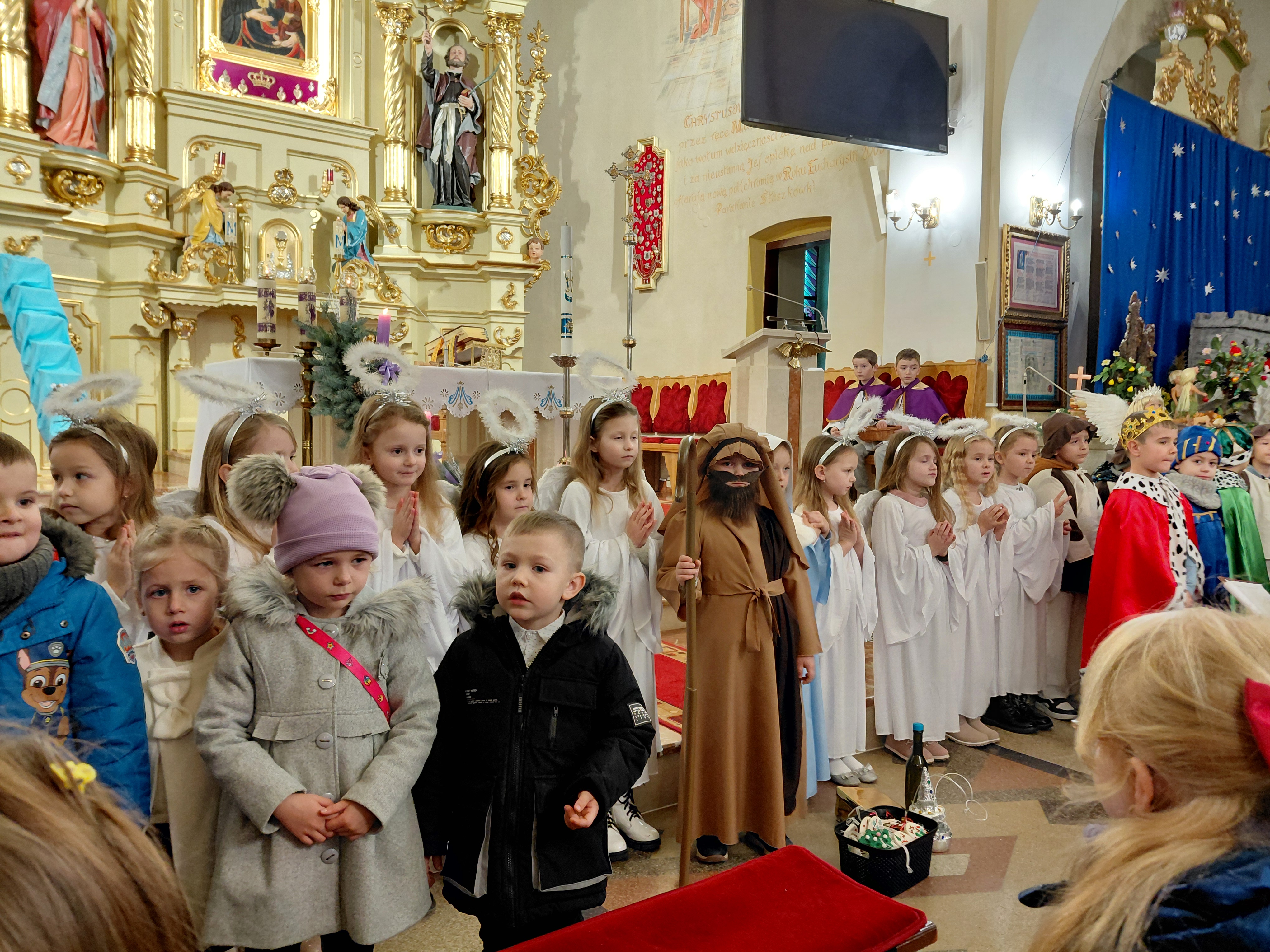 W ostatnią niedzielę Adwentu czyli 21 grudnia 2025r., dzieci z Przedszkola Samorządowego w Staszkówce, przedstawiły w kościele jasełka pt. "Pielgrzymi nadziei". Przed Mszą św. o godzinie 12.00 mali aktorzy, przebrani we właściwe dla swojej roli stroje, zgromadzili się przed ołtarzem, by jeszcze raz przypomnieć historię Bożego Narodzenia. Dzieci z odwagą recytowały swoje kwestie. "Baranki" tańczyły swój taniec a najmłodsze Biedronki przyniesły zrobione przed przedszkolaki ozdoby z masy solnej na parafialną choinkę.Całość zakończyła się wymowną pastorałką pt. "Czy jesteś gotów na przyjście Pana?"