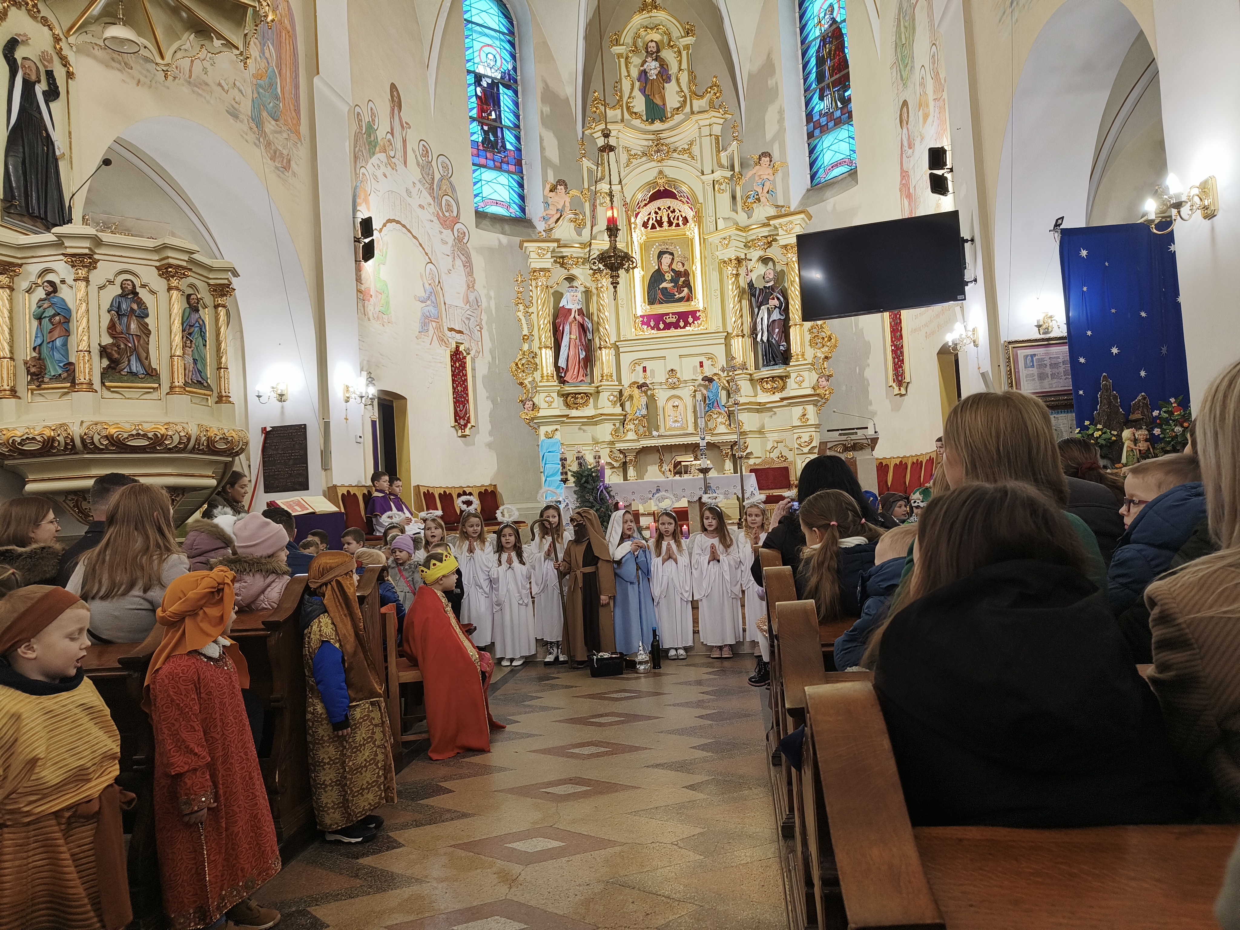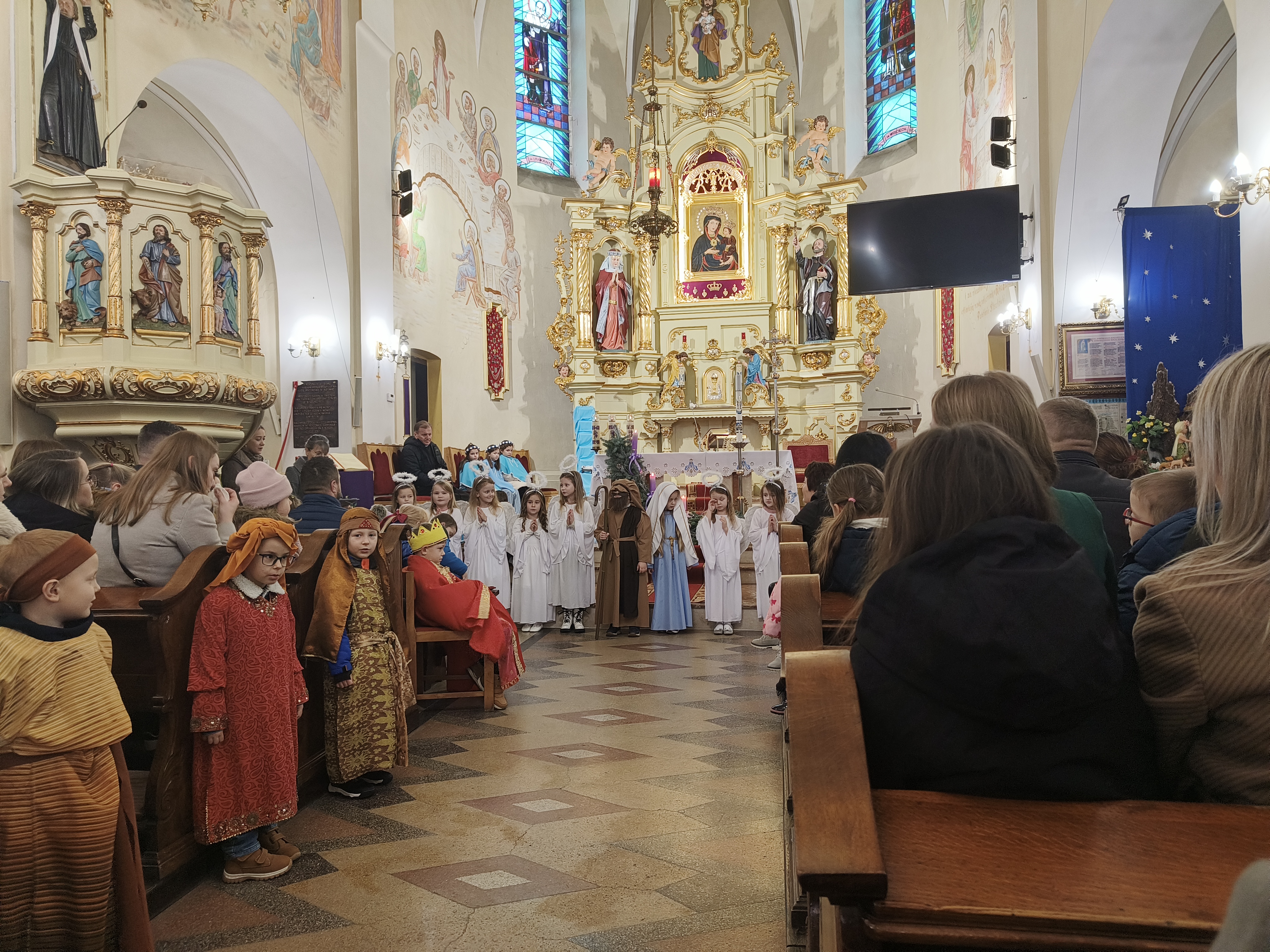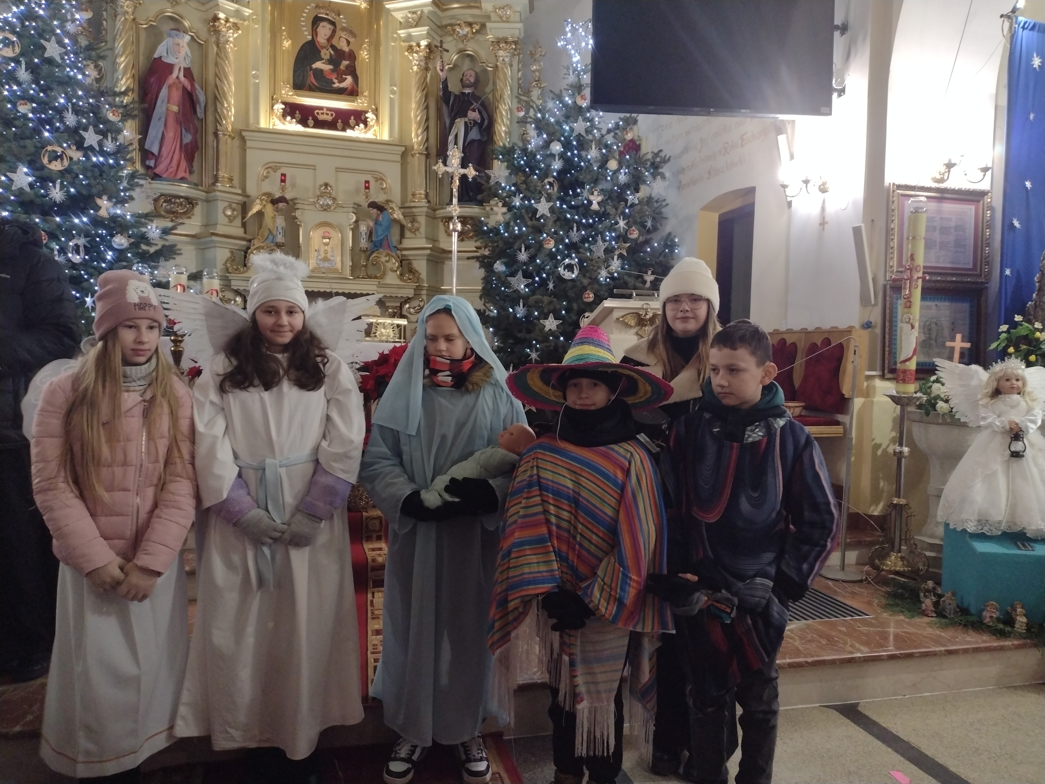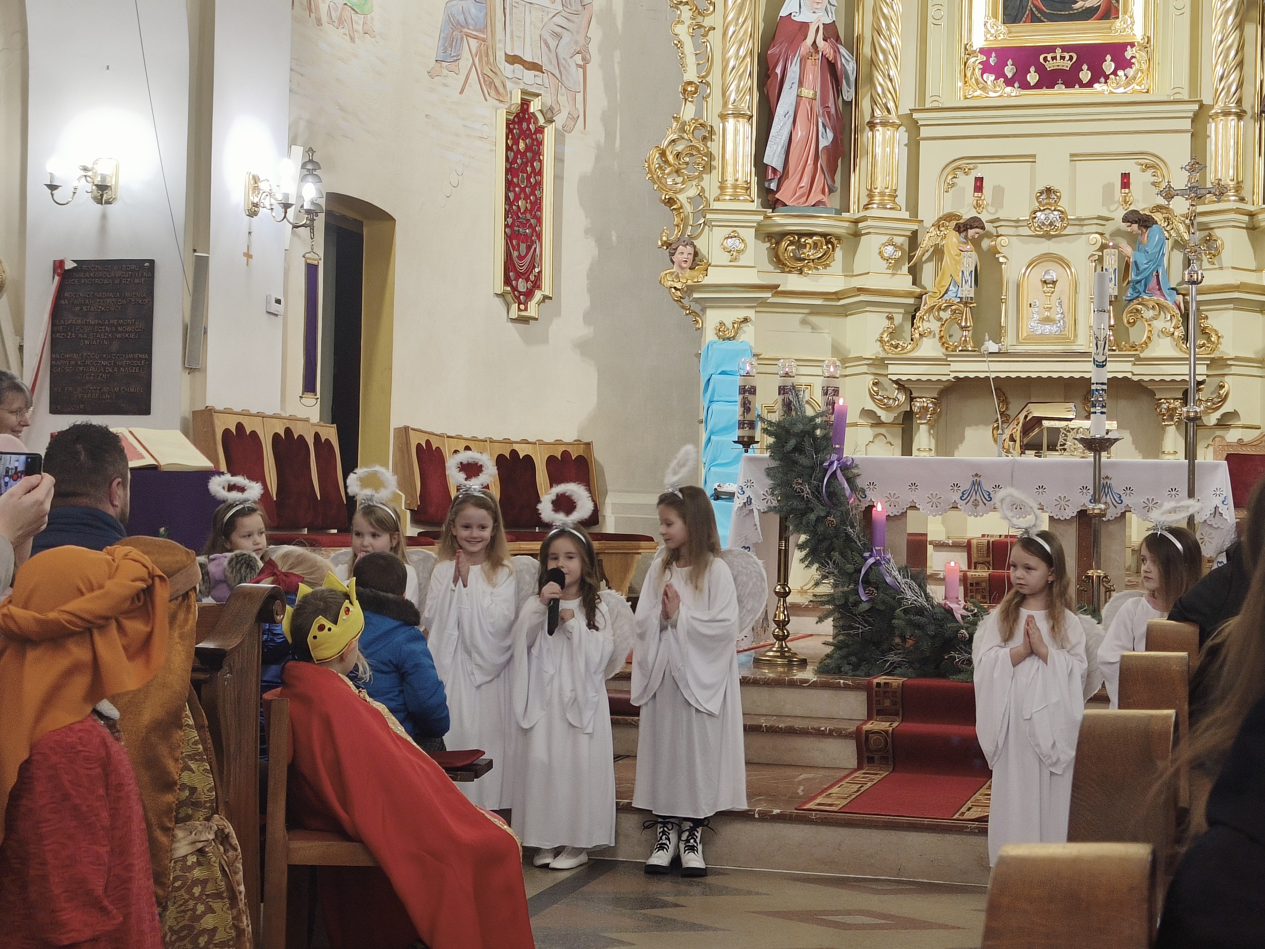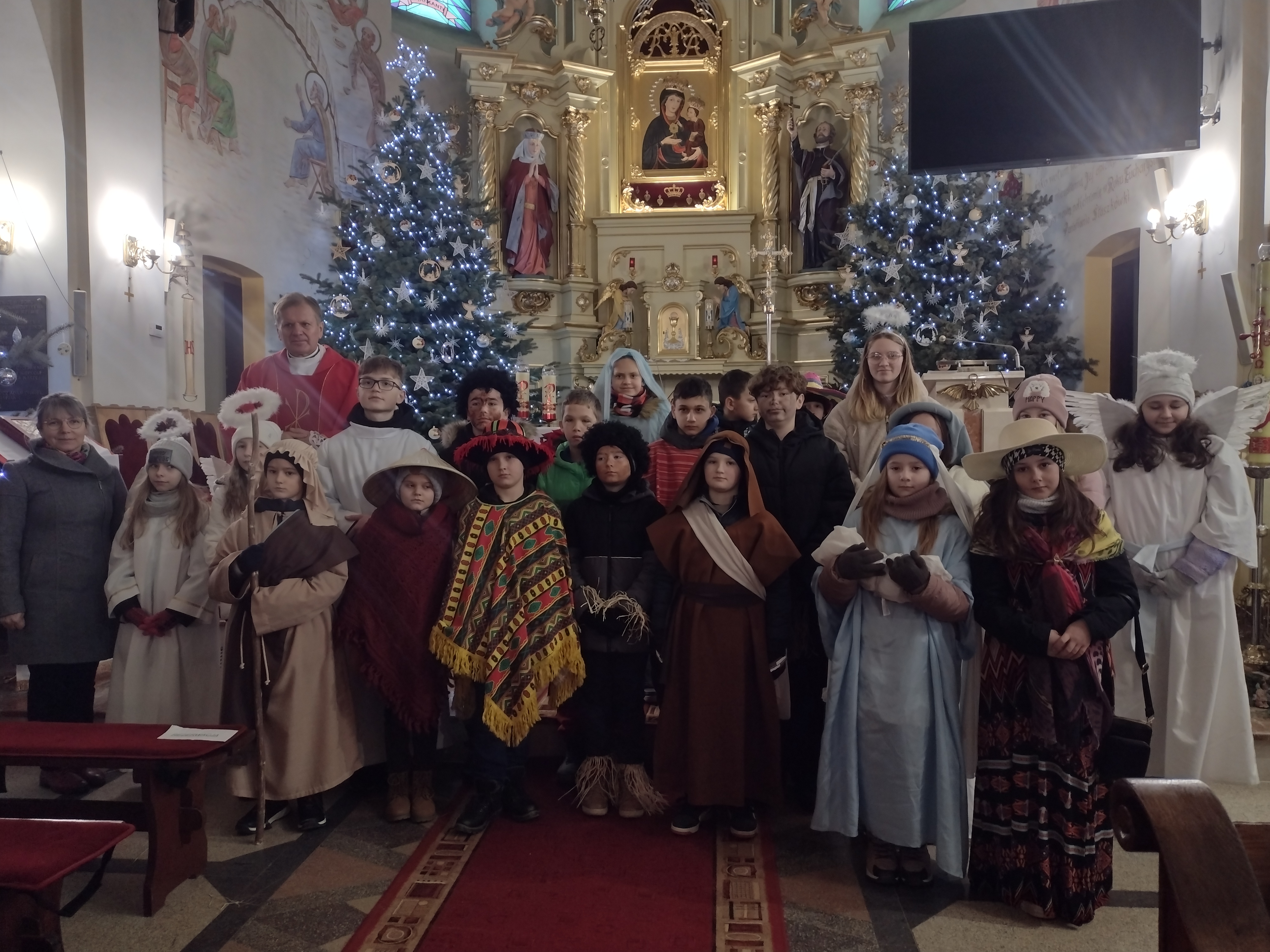 W ostatnią niedzielę Adwentu czyli 21 grudnia 2025r., dzieci z Przedszkola Samorządowego w Staszkówce, przedstawiły w kościele jasełka pt. "Pielgrzymi nadziei". Przed Mszą św. o godzinie 12.00 mali aktorzy, przebrani we właściwe dla swojej roli stroje, zgromadzili się przed ołtarzem, by jeszcze raz przypomnieć historię Bożego Narodzenia. Dzieci z odwagą recytowały swoje kwestie. "Baranki" tańczyły swój taniec a najmłodsze Biedronki przyniesły zrobione przed przedszkolaki ozdoby z masy solnej na parafialną choinkę.Całość zakończyła się wymowną pastorałką pt. "Czy jesteś gotów na przyjście Pana?"