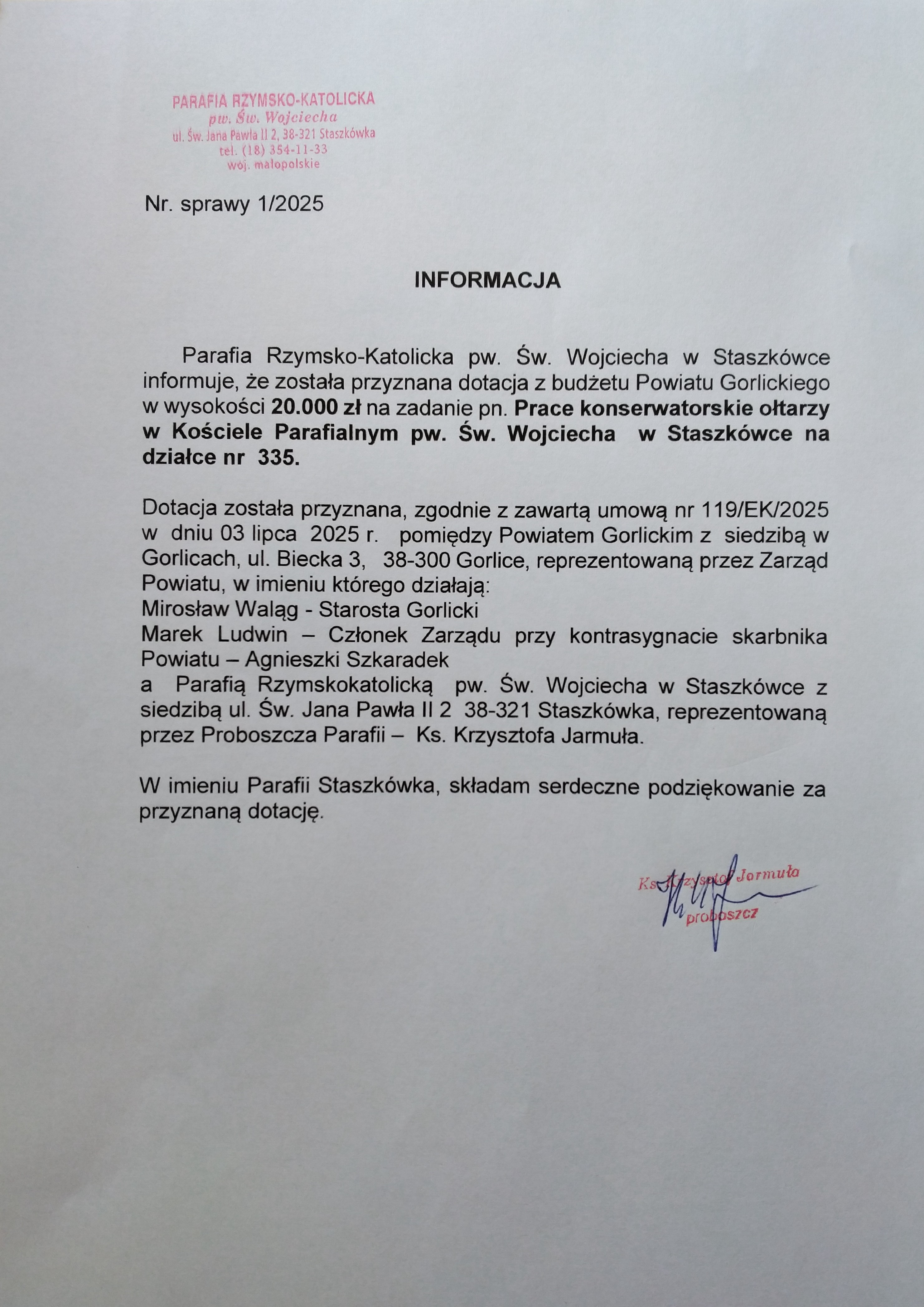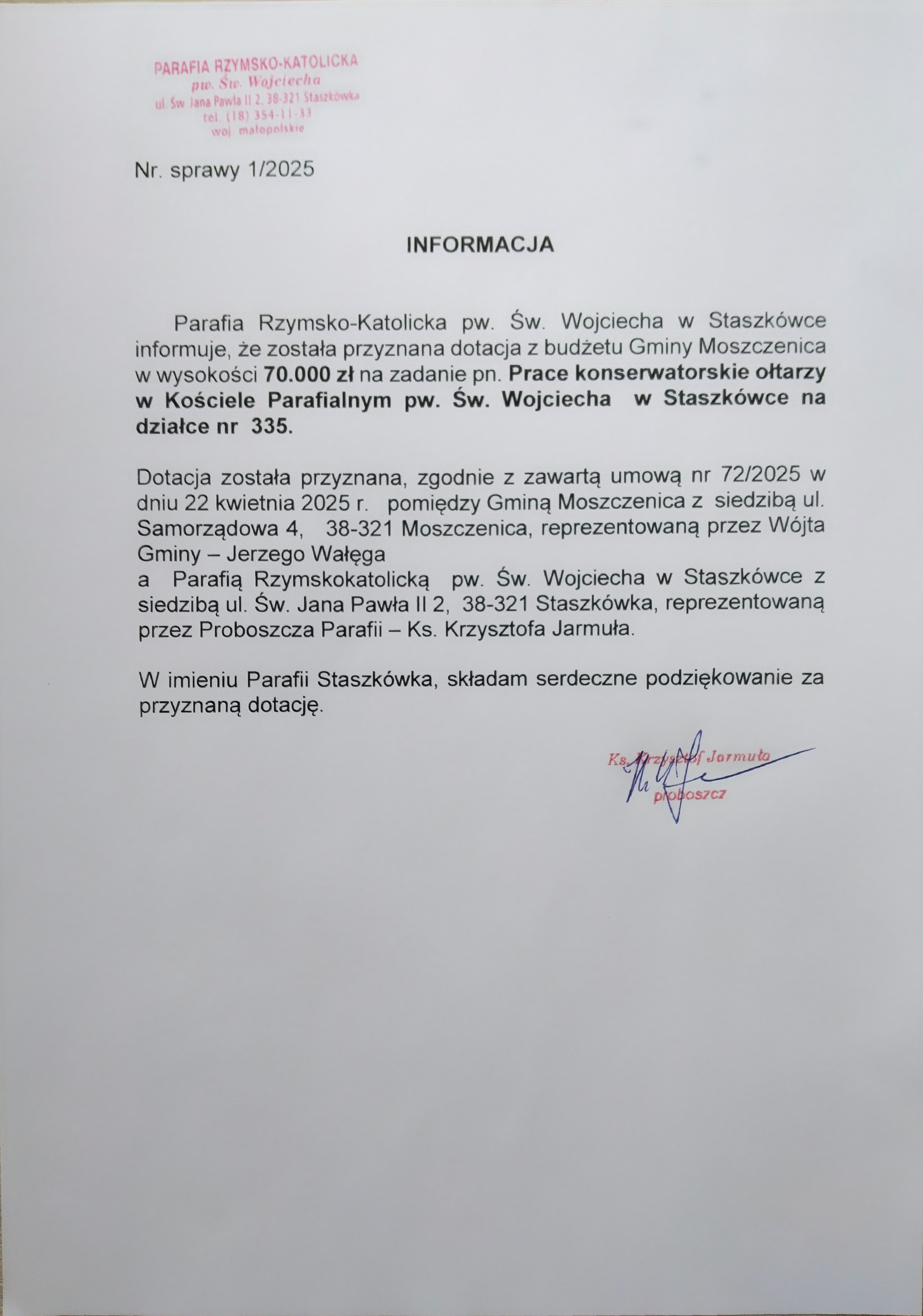Uczniowie Szkoły Podstawowej w Staszkówce pragną zadedykować księdzu proboszczowi - Krzysztofowi, który obchodzi srebrny jubileusz kapłaństwa oraz wszystkim parafianom krótką scenkę z życia świętego Wojciecha - patrona naszej parafii. Przedstawienie odbędzie się w najbliższą niedzielę, tj. 8 VI 2014roku, przed sumą o godz. 10. 00 w kościele.
